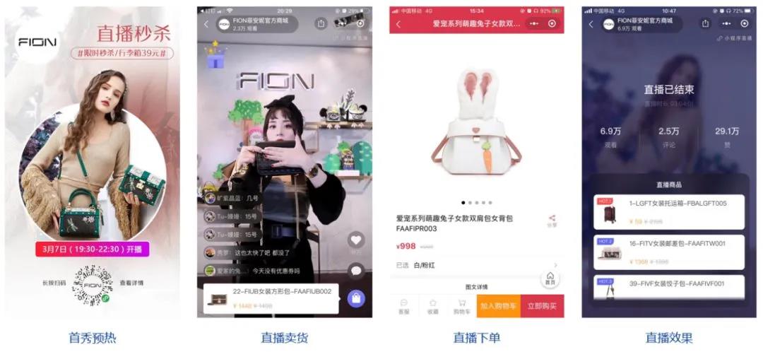 在疫情影響最嚴(yán)重的3月份,線下門(mén)店全部關(guān)閉,業(yè)績(jī)降到歷史最低點(diǎn),在今年女神節(jié)前夕,時(shí)尚皮具品牌菲安妮啟動(dòng)小程序直播首秀,收獲觀看人數(shù)6.9萬(wàn)、評(píng)論2.5萬(wàn)、點(diǎn)贊29.1萬(wàn)的驕人成績(jī)!在小程序商城交易方面,也是成績(jī)斐然:成交筆數(shù)環(huán)比提升近1000%,成交金額環(huán)比提升600%!