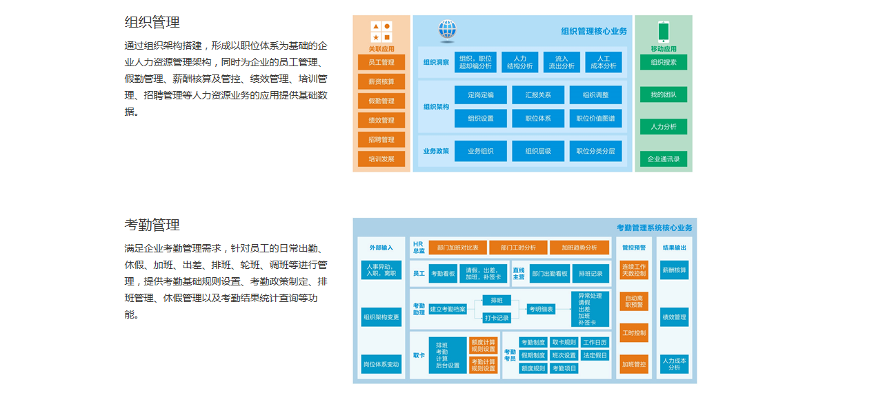 通過組織架構(gòu)搭建,形成以職位體系為基礎(chǔ)的企業(yè)人力資源管理架構(gòu),同時(shí)為企業(yè)的員工管理、假勤管理、薪酬核算及管控、績效管理、培訓(xùn)管理、招聘管理等人力資源業(yè)務(wù)的應(yīng)用提供基礎(chǔ)數(shù)據(jù)。它支持可視化的組織、崗位拖拽式調(diào)整,滿足變動(dòng)環(huán)境下的組織設(shè)立、拆分和合并,實(shí)現(xiàn)變動(dòng)歷史的追溯和預(yù)期變動(dòng)的模擬。并可基于價(jià)值鏈對(duì)企業(yè)崗位進(jìn)行多維度的分類和分層管理,實(shí)現(xiàn)深入的人力洞察分析。